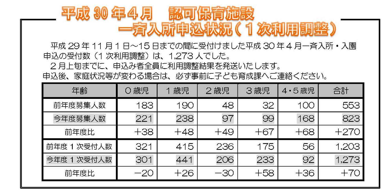 現段階で450名が認可に入れない。武蔵野市 一次利用調整を公表 武蔵野市は、平成30年4月の認可保育園への入園申込状況を公表した(1次利用調整)。認可園の募集人数823名分に対して申込者数は1273名。450名が現在のところ、認可保育園に入れない状況にある。昨年に比べて70名が増えている。 続きを読む