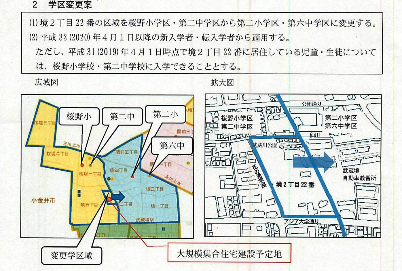 武蔵野市立桜野小学校の学区変更案が示された。同小学校は、児童数が増え市内で最も多い児童数となり、学区内で計画されている大規模マンションによりさらに児童数が増えると想定されていることから学区の変更が検討されていた。