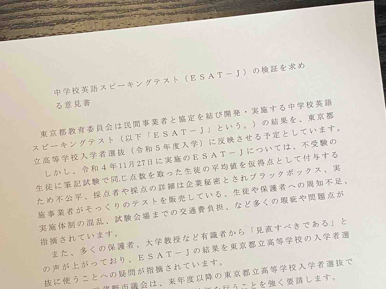 武蔵野市議会 都立高入試 スピーキングテストへ意見書可決