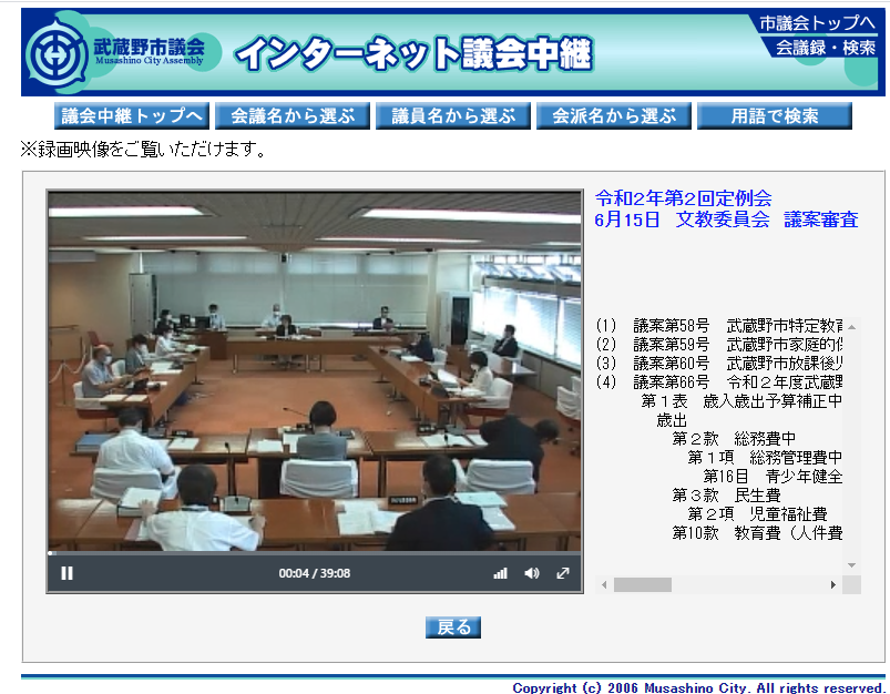 武蔵野市議会は5月18日の議会運営委員会で6月の常任委員会と外環道路特別委員会のインターネット中継を臨時的措置として実施することを決めた。