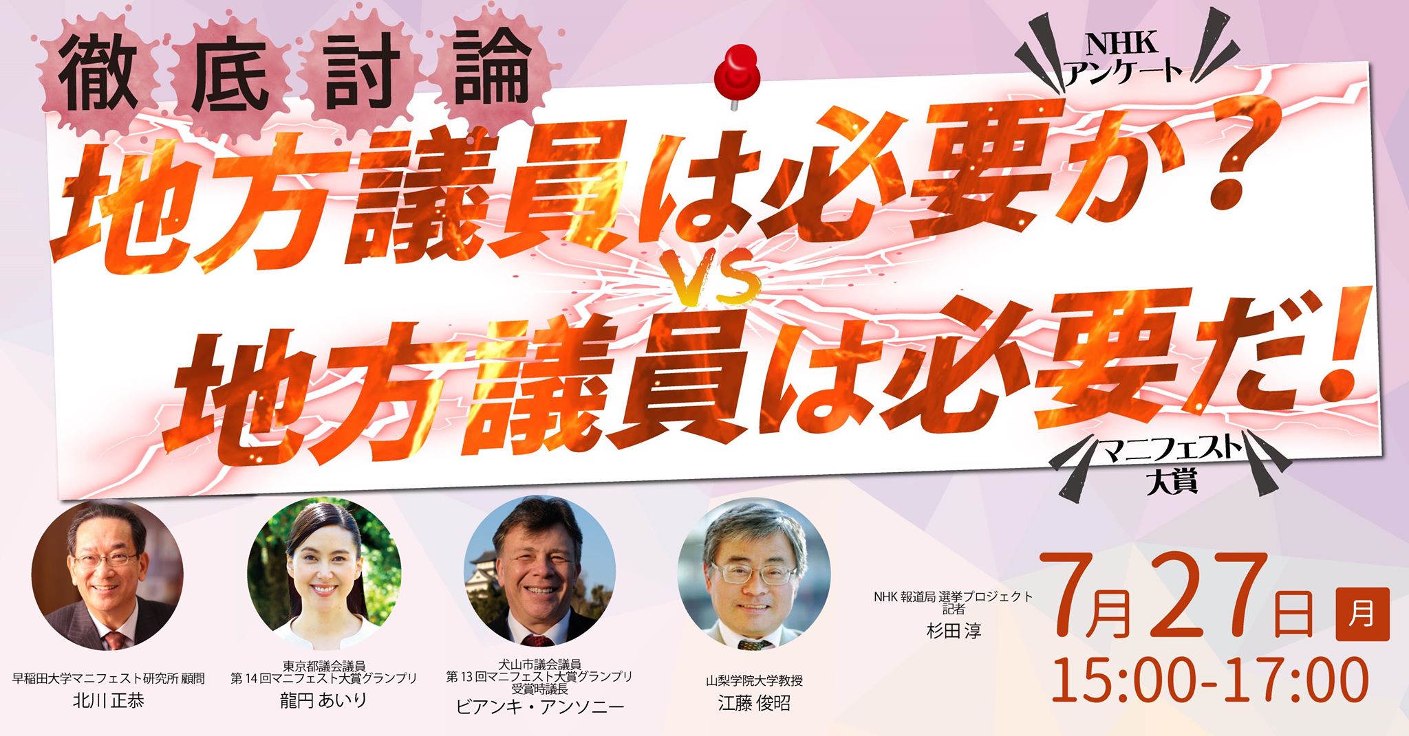 NHKが行った地方議員3万2,000人へのアンケートをもとに出版された 『地方議員は必要か?』の出版記念と第15回マニフェスト大賞記念シンポジウムが開催される。題して、地方議員は必要か? vs 地方議員は必要だ! 徹底討論。